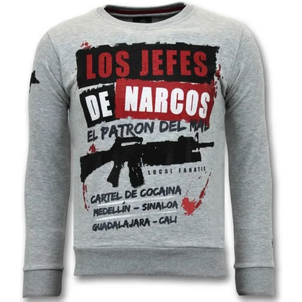Exclusieve Sweater Heren - Los Jefes De Narcos - Grijs - Specificaties:- Exclusieve Sweater Heren - Los Jefes De Narcos - Artikelcode:11-6382G- Kleur: Grijs- Seizoen: Voorjaar / Najaar- Kraag: Ronde Kraag- Mouwen: Lange Mouw- Patroon: Print, Rhinestone- Kwalitatief: Hoogwaardige Afwerking- Materiaal: 84% Katoen en 16% Lycra- Weefsel: Geweven- Pasvorm: Getailleerd Italiaans- Wasvoorschrift: Handwas, Binnenste buiten wassen (Niet in de droger)- Beschikbare maten: S - M - L - XL - XXLLocal Fanatic is een jong merk voor modebewuste mannen die aandacht besteden aan kleding en uiterlijk met de Allure en Glamour. Kenmerkend van het merk zijn de zeefdruk- en digitaal prints die gegarandeerd staan voor kwaliteit van vooruitstrevende stoffen in Italiaanse pasvormen.