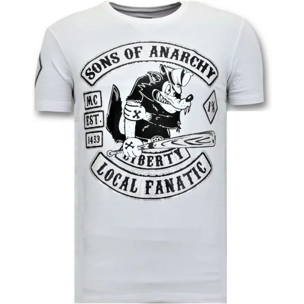 Exclusieve Heren T shirt met Print - Sons of Anarchy MC - Wit - Specificaties:- Rhinestones T-shirt Mannen- Sons of Anarchy MC- Artikel : 11-6369W- Kleur: Zie Afbeelding- Seizoen: Voorjaar / Najaar- Kraag: Ronde Kraag- Patroon: Rhinestones, Borduur en Glitterdruk- Kwalitatief Hoogwaardige Afwerking- Materiaal: 93% Katoen en 7% Lycra- Pasvorm: Getailleerd Italiaans- Wasvoorschrift: Handwas, Binnenste buiten wassen (Niet in de droger)- Beschikbare maten: S - M - L - XL - XXLLocal Fanatic is een jong merk voor modebewuste mannen die aandacht besteden aan kleding en uiterlijk met de Allure en Glamour.Kenmerkend van het merk zijn de zeefdruk- en digitaal prints die gegarandeerd staan voor kwaliteit van vooruitstrevende stoffen in Italiaanse pasvormen.