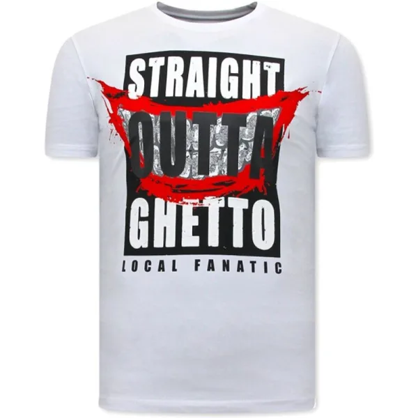 Stoere Mannen T shirts - Straight Outta Ghetto - Wit - Specificaties:- Stoere Mannen T shirts - Straight Outta Ghetto- Artikel code: 11-6425- Kleur: Zie Afbeelding - Wit- Seizoen: Voorjaar / Najaar- Kraag: Ronde Kraag- Patroon: Print- Kwalitatief Hoogwaardige Afwerking- Materiaal: 93% Katoen en 7% Lycra- Pasvorm: Getailleerd Italiaans- Wasvoorschrift: Handwas, Binnenste buiten wassen (Niet in de droger)- Beschikbare maten: S - M - L - XL - XXLLocal Fanatic is een jong merk voor modebewuste mannen die aandacht besteden aan kleding en uiterlijk met de Allure en Glamour. Kenmerkend van het merk zijn de zeefdruk- en digitaal prints die gegarandeerd staan voor kwaliteit van vooruitstrevende stoffen in Italiaanse pasvormen.
