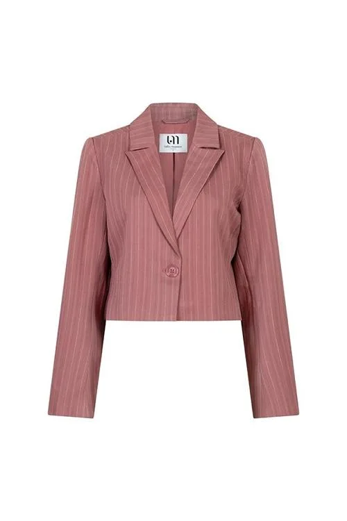 Deze blazer voor dames is uitgevoerd in een warme rozetint met een subtiel krijtstreepdessin. Het korte, rechte silhouet sluit met één ton-sur-ton knoop en heeft een klassieke reverskraag. Lange mouwen met elegante splitten aan de manchet zorgen voor een verfijnde lijn. De voorzijde is strak zonder zichtbare zakken. Binnenin zie je het LM-logo. Een geraffineerd kledingstuk van Lofty Manner binnen de categorie Dames, Jassen en Jacks.