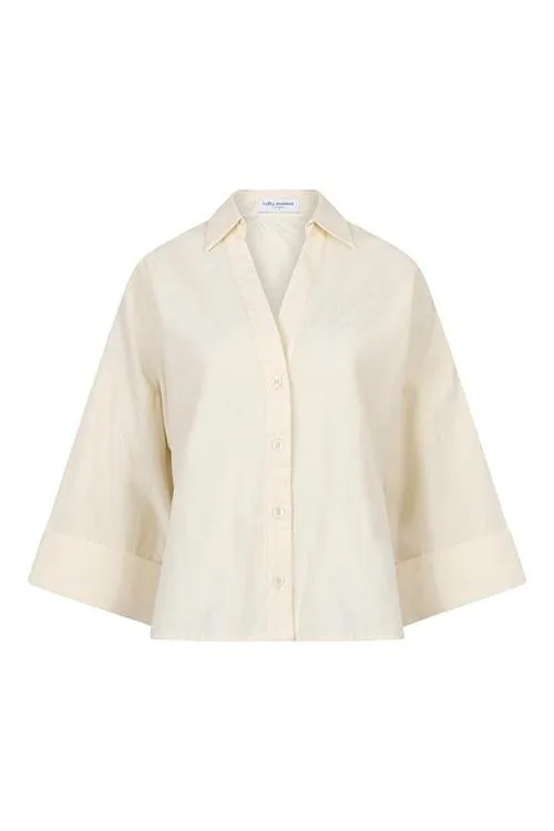 De blouse heeft een klassieke kraag en een volledige doorknoopsluiting met fijne knopen. De wijdvallende 3/4-mouw met extra brede manchet geeft lucht en vorm. De pasvorm is recht en iets korter, met een subtiel afgeronde zoom. Het effen, licht-vanille kleurbeeld maakt combineren eenvoudig. Het kledingstuk is uitgevoerd in een glad, licht geweven kwaliteit die comfortabel aanvoelt. Zonder zakken en zonder zichtbaar logo; dessin: uni. Een tijdloze keuze van Lofty Manner voor dames.