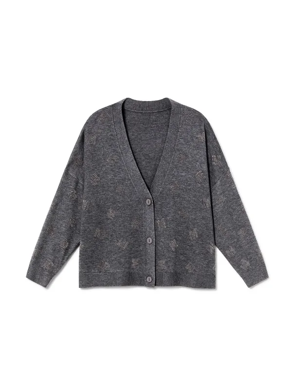 Design: Geribd ceintuurtje; Type sluiting: Knoopsluiting; Materiaal: Knitwear; Halstype: V-hals; Motief: Mélange; Details: Sierstenen; Extra's: Fully fashioned; Pasvorm: Losse pasvorm; Armlengte: Lange mouw; Lengte: Normale lengte