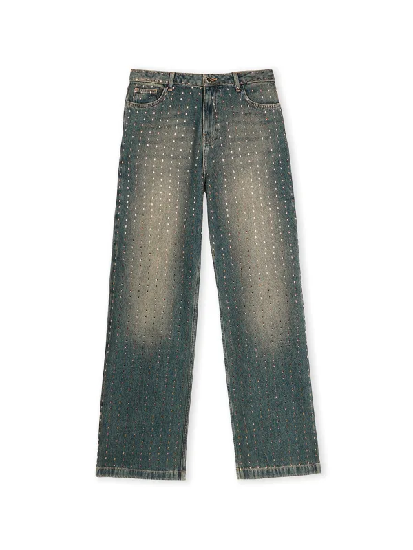 Design: Ritssluiting, 5-pocket-style; Type sluiting: Ritssluiting; Materiaal: Denim; Details: Sierstenen; Extra's: Glitterend, Riemlussen; Wassing: Heavy washed; Lengte: Lang/maxi; Pasvorm: Bootcut; Taillehoogte: High waist