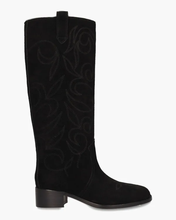 Boots voor dames in paardrijstijl model Cala 187B60BK uit de collectie van Lola Cruz. Deze toffe laars op een ronde leest heeft een zwart suède bovenwerk met een opgestikt Cowboypatroon aan weerskanten van de circa 37 cm hoge schacht. De binnenzijde is in leer met een vast voetbed uitgevoerd. Lederen lussen bovenaan werken de klassieke boots