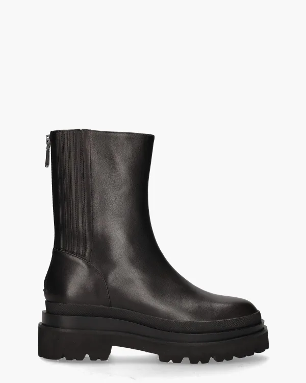 Enkelboots voor dames Pruga 032T14BK van het Spaanse merk Lola Cruz. Deze zwarte motorstyle booties zijn gemaakt van leer. De binnenkant is ook in leer met een vast voetbed uitgevoerd. De rubberen 2 cm hoge profielzool en grove hak van 5 cm maken de stoere Grunge boots helemaal af. De schacht is circa 19 cm hoog en is afgewerkt met elastiek.