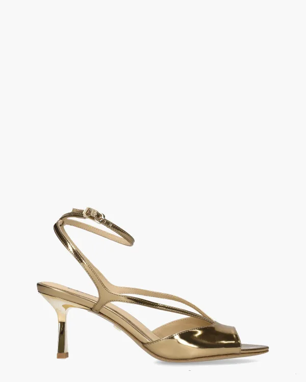 Zomerse strappy pumps voor dames Streep 148Z17BK van het Spaanse merk Lola Cruz. Dit model straalt klasse uit door het metallic, glad gepolijste leren bovenwerk in een goudkleurige tint. De binnenkant is volledig met leer gevoerd, wat zorgt voor een zachte en comfortabele pasvorm. Het verstelbare enkelbandje met een gouden gespje biedt een