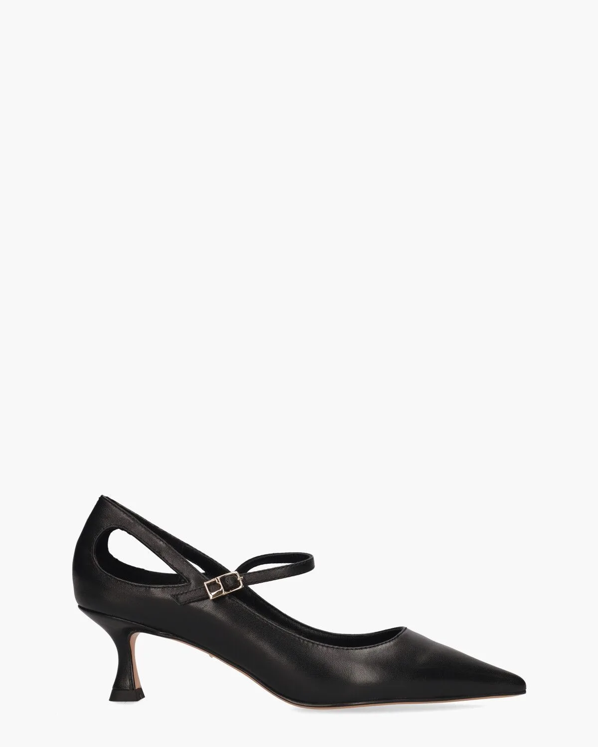 Pumps voor dames, model Tina 208Z13BK, afkomstig uit de collectie van het Spaanse merk Lola Cruz. Deze elegante pumps hebben een spitse neus en een bovenwerk van zwart leer met cut-outs opzij. De binnenkant is ook uitgevoerd in leer voor ultiem comfort. Met het gouden gespje kun je de pasvorm naar wens aanpassen. De hak heeft een hoogte van