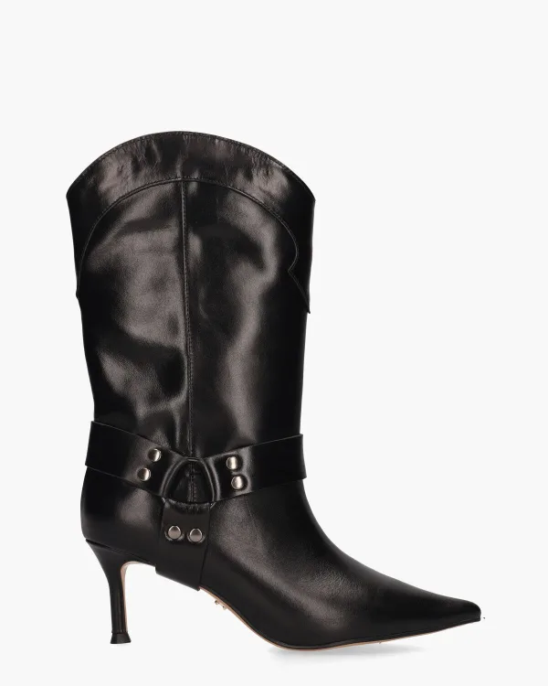 Boots voor dames York 020B12BK van het merk Lola Cruz. Deze zwarte dameslaars heeft een upper gemaakt van leer en is ook gevoerd met leer. Dit prachtige model met een spitse neus heeft een schachthoogte van circa 21 cm versierd met Western-accenten. De hoge hak van ongeveer 6,5 cm geeft de booties een supervrouwelijke look terwijl de leren
