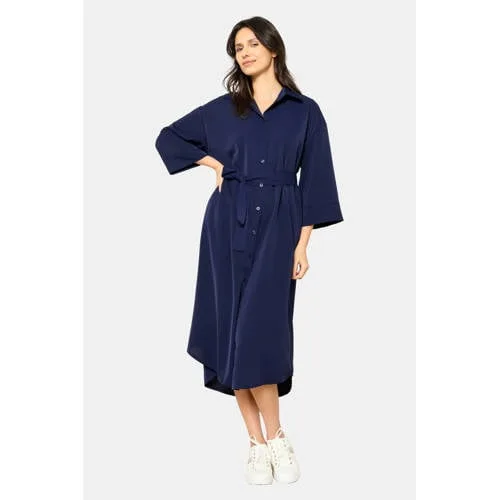 Deze donkerblauwe blousejurk van LOLALIZA heeft driekwart mouwen en een klassieke kraag. De jurk is gemaakt van polyester en heeft een knoopsluiting. Met de bijgeleverde ceintuur geef je de jurk een mooie fit.