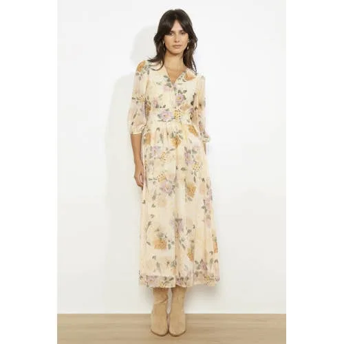 Deze lange, sierlijke LOLALIZA jurk brengt een lichte, nostalgische sfeer in je garderobe. De empiretaille legt het accent net onder de buste, waardoor een verfijnd en vloeiend silhouet ontstaat. De lichtgele kleur in combinatie met de bloemenprint zorgt voor een zachte uitstraling. Subtiele glitters vangen het licht, waardoor de stof bij iedere beweging zichtbaar verandert.Verfijnde details voor een vrouwelijk silhouet Lang model met maxi lengte voor een volledig bedekte rok Empiretaille die het bovenlichaam accentueert en soepel over de heupen valt Driekwart rechte mouwen voor een luchtig en bedekkend effect Lichtgele basis met bloemenprint en glitters voor een opvallend dessin V-hals die het decolleté subtiel laat zien Elastische inzet aan de taille voor een comfortabele pasvorm A-lijn model zonder zakken voor een rustige, gestroomlijnde vormZwierend model voor allerlei momentenDeze maxi jurk komt goed tot zijn recht op een zomerse dag, een diner of een speciale gelegenheid. De lichte stof beweegt soepel mee terwijl je loopt, waardoor het wikkelachtige karakter duidelijk naar voren komt.De stijl van LOLALIZALOLALIZA staat voor vrouwelijke ontwerpen met aandacht voor pasvorm en zorgvuldige details. Elke collectie sluit aan op actuele trends, met kleding die prettig draagt en geschikt is voor alledaagse momenten en bijzondere gelegenheden.Een jurk die met kleur, print en glinsterende accenten direct opvalt in je garderobe.
