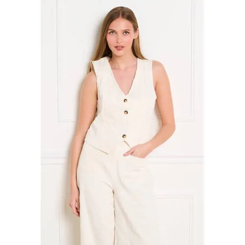 Voor een lichte, zomerse laag is dit ecru gilet van katoen een rustige toevoeging aan je garderobe. Het mouwloze vest heeft een gestructureerde pasvorm en valt kort, waardoor je taille goed uitkomt. De V-hals en knoopsluiting vormen samen een verzorgd geheel. Door de ecru kleur en het subtiele sterborduursel krijgt het een duidelijk detail zonder druk te ogen.Praktische details voor elke dag Gemaakt van 100% katoen, voelt luchtig en zacht aan op de huid Korte lengte, ideaal boven een wijde broek of hoge taille jeans Mouwloos model met V-hals voor een open, zomerse look Knoopsluiting aan de voorkant om open of dicht te dragen Effen ecru kleur met subtiel sterborduursel en zichtbare textuur Geen zakken voor een strak silhouet Onderdeel van een co-ord set met bijpassende wijde broek Wasbaar op 30 graden, praktisch voor regelmatig dragenSolo of als set te dragenDit gilet past bij je dagelijkse looks in de zomer. Draag het solo als top op een warme dag, of combineer het gelaagd over een T-shirt of blouse. In combinatie met de bijpassende wijde broek ontstaat een complete set die rustig oogt en duidelijk bij elkaar hoort.LOLALIZA: eigentijdse mode voor elke dagLOLALIZA staat voor vrouwelijke, eigentijdse mode die je makkelijk inpast in je dagelijkse leven. De ontwerpen zijn afgestemd op moderne vrouwengarderobes, met aandacht voor draagbare pasvormen en doordachte details. Zo voeg je met dit gilet een veelzijdig kledingstuk toe dat je vaak uit de kast pakt.Een luchtige basic met subtiele details, voor dagen waarop je zonder moeite verzorgd voor de dag wilt komen.
