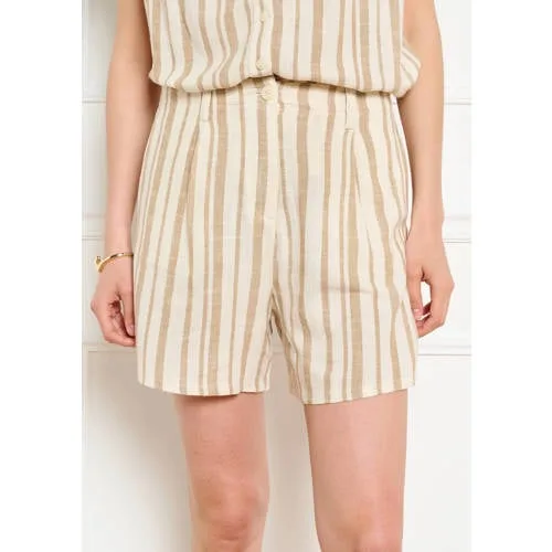 Deze gestreepte korte broek van LOLA LIZA heeft een lichte, zomerse uitstraling die direct uitnodigt om aan te trekken zodra de temperatuur stijgt. De ecru / lichtbruine streep geeft een zachte, frisse look die makkelijk combineert met basics in je kast. Dankzij het hoge model en de losse pasvorm voelt de short luchtig aan en biedt dit model veel bewegingsvrijheid, ideaal voor drukke dagen of een ontspannen weekend.Luchtige short met flatterend tailleaccent Gemaakt van 70% viscose en 30% linnen, voor een soepele stof met een natuurlijke, luchtige touch High waist model dat je taille accentueert en mooi valt over de heupen Loose fit voor een relaxed silhouet en extra bewegingsvrijheid Knoopsluiting aan de voorkant voor een nette, verzorgde afwerking Zakken voor en achter, handig voor kleine essentials Gestreepte print in ecru / lichtbruin, passend bij het lenteseizoen en dagelijkse outfits Wasbaar op 30 graden, zodat je de short eenvoudig fris houdtIdeaal voor zonnige dagen en casual outfitsDeze casual short past goed bij een simpel T-shirt of een top in een zachte tint. Voor een moderne set combineer je de korte broek met de bijpassende blouse, zodat je in één keer een complete, afgestemde look hebt. Fijn voor werk, stadse uitstapjes of een dagje terras.LOLA LIZA, eigentijdse stijl voor elke dagLOLA LIZA ontwerpt kleding met oog voor vrouwelijkheid, kleur en draagbaarheid. De collecties sluiten aan op het dagelijks leven, met items die je makkelijk combineert en vaak uit de kast pakt. Zo voeg je met deze short een sfeervol en veelzijdig kledingstuk toe aan je garderobe.Een lichte, gestreepte basis die je hele lente en zomer weer opnieuw wilt aantrekken.