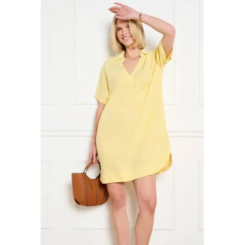 Deze gele linnen polojurk van LOLALIZA is een lichte en luchtige keuze voor zonnige dagen. De jurk heeft een ontspannen pasvorm en valt in een mini lengte, waardoor je benen goed zichtbaar zijn. De polokraag geeft het geheel een nette uitstraling, terwijl de soepele snit zorgt voor een comfortabele pasvorm voor de hele dag.Licht en makkelijk te dragen Gemaakt van 55% linnen en 45% viscose, voor een luchtig en soepel draaggevoel Effen gele kleur voor een frisse, zomerse look Mini lengte, ideaal voor warme lentedagen en zomeravonden Korte rechte mouwen voor extra bewegingsvrijheid Polo kraag zonder sluiting voor een rustige, verzorgde halslijn Geen zakken voor een strak en clean silhouet Wasbaar op 30 graden, handig in het dagelijkse onderhoudIdeaal voor dagelijkse outfitsDeze korte jurk uit de 'Daily' collectie is geschikt voor alledaagse momenten. Draag de jurk met sandalen of sneakers voor een casual look, of combineer met een lichte cardigan wanneer het wat frisser is. De soepele stof volgt je bewegingen gemakkelijk, wat prettig is tijdens een drukke dag.LOLALIZA: vrouwelijk en modernLOLALIZA ontwerpt kleding met aandacht voor het dagelijkse leven, waarbij draagcomfort centraal staat. De collecties combineren een vrouwelijke stijl met eigentijdse details. Met deze jurk haal je een praktisch garderobestuk in huis dat in verschillende seizoenen te dragen is.Een praktische jurk voor dagen waarop je licht, verzorgd en toch ontspannen gekleed wilt gaan.