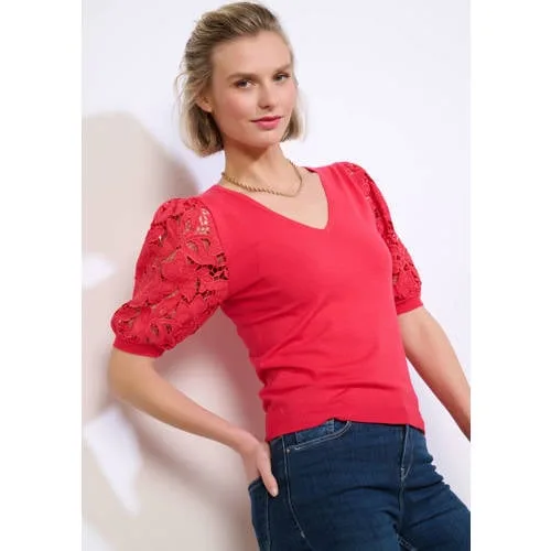 Deze LOLALIZA top met kanten mouwen is een zachte trui met een rustige en vrouwelijke uitstraling. De losvallende pasvorm valt soepel om het lichaam en voelt relaxed, terwijl de V-hals de halslijn zichtbaar maakt. De korte, rechte mouwen zijn afgewerkt met verfijnd kant, wat zorgt voor een subtiel detail dat extra karakter geeft aan de look.Zachte stof en verfijnde details Gemaakt van 72% viscose en 28% polyester, voor een soepele stof die prettig aanvoelt op de huid Losse pasvorm voor een ontspannen silhouet dat niet strak aansluit V-hals die de hals en sleutelbenen benadrukt Korte rechte mouwen met kanten afwerking voor een elegante uitstraling Effen kleur, waardoor de top goed te combineren is met broeken en rokken Zonder zakken voor een rustig geheelVeelzijdig in elke garderobeDeze trui-top is geschikt voor verschillende momenten op de dag. Combineer met een jeans voor een casual outfit of draag de top op een nette broek of rok voor een meer geklede combinatie. De soepele viscosemix maakt het een praktisch item om het hele jaar door te dragen, met of zonder extra laagje.LOLALIZA met oog voor stijlLOLALIZA staat voor collecties met herkenbare pasvormen en doordachte details. De focus ligt op modieuze items die makkelijk te dragen zijn in het dagelijks leven, met aandacht voor comfort. Met deze top komt er een veelzijdig kledingstuk bij in de kast.Een zachte basis met elegante details die zich eenvoudig laat combineren.