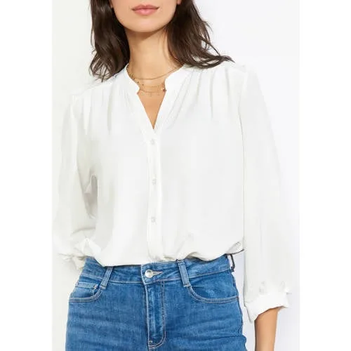 Deze luchtige ecru dames blouse van LOLALIZA is een praktische basic voor elke dag. De subtiele V-hals, lichte ballonmouwen en een mao kraag geven een verzorgde uitstraling zonder moeite. De soepele stof valt mooi om het lichaam en beweegt gemakkelijk met je mee, ideaal voor een drukke dag op kantoor of een ontspannen lunchafspraak.Verzorgde details voor elke dag Luchtige blouse met subtiele V-hals voor een open, maar niet te diepe halslijn Licht gepofte driekwart mouwen met ballonvorm voor een vrouwelijk silhouet Mao kraag zorgt voor een moderne, rustige halslijn zonder opvallende kraagpunten Effen ecru kleur die makkelijk te combineren is met jeans, pantalon of rok Zonder zakken voor een strakke, verfijnde look Geschikt voor het lente seizoen, maar ook goed door te dragen in laagjes Wasbaar op 30 graden, zodat de blouse eenvoudig te onderhouden isVan werkdag tot weekendDeze blouse past net zo goed bij een nette broek als bij een relaxed gedragen jeans. Voor een zakelijke dag combineer je de ecru top met een rechte pantalon en loafers. In het weekend volstaat een mom jeans en sneakers voor een ontspannen, maar verzorgde look.LOLALIZA: moderne stijl met een vrouwelijke touchLOLALIZA ontwerpt kleding die het dagelijks leven comfortabeler en stijlvoller maakt. De collecties sluiten aan op het ritme van alledag, met draagbare items die je eenvoudig mixt en matcht. Zo haal je met deze blouse een betrouwbare basis in huis waar je lang plezier van hebt.Een lichte, veelzijdige blouse waarop je elk seizoen kunt terugvallen.