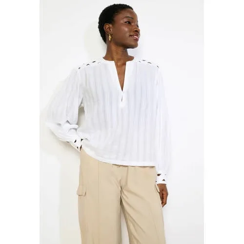 Deze witte katoenen dames blouse met lange mouwen van LOLALIZA heeft een luchtige uitstraling met een subtiel bohemien karakter. De soepele valling volgt je bewegingen en het effen witte ontwerp oogt rustig en verzorgd. De licht volumineuze, rechte mouwen geven net wat extra volume, terwijl de open V-hals een moderne, vrouwelijke toets toevoegt. Ideaal voor een werkdag, een etentje of een relaxed moment in het weekend.Verzorgde details voor elke dag Gemaakt van 100% katoen, voelt zacht en comfortabel aan op de huid Effen witte kleur, makkelijk te combineren met je favoriete broeken en rokken V-hals met open detail voor een lichte, vrouwelijke halslijn Lange, rechte mouwen met een licht volumineus effect voor een verfijnd silhouet Geschikt voor dagelijks gebruik in de 'Daily' collectie Wasbaar op 30 graden, praktisch in onderhoudLuchtige blouse voor het lenteseizoenDeze top past goed bij het lentegevoel door de luchtige stof en de lichte kleur. Combineer de blouse met een jeans en sneakers voor een casual look of met een nette broek en hakken voor een meer geklede outfit. Door het open halsdetail is een subtiele ketting snel genoeg voor een complete set.LOLALIZA: vrouwelijke stijl met een moderne twistLOLALIZA ontwerpt mode speciaal voor vrouwen die houden van eigentijdse, draagbare items. De collecties combineren vrouwelijke lijnen met comfortabele pasvormen en sluiten aan bij het dagelijkse leven, van kantoor tot vrije tijd. Met deze blouse kies je voor een kledingstuk dat stijl en gemak op een heldere manier samenbrengt.Een lichte, veelzijdige blouse die zich eenvoudig aanpast aan jouw day-to-day garderobe.