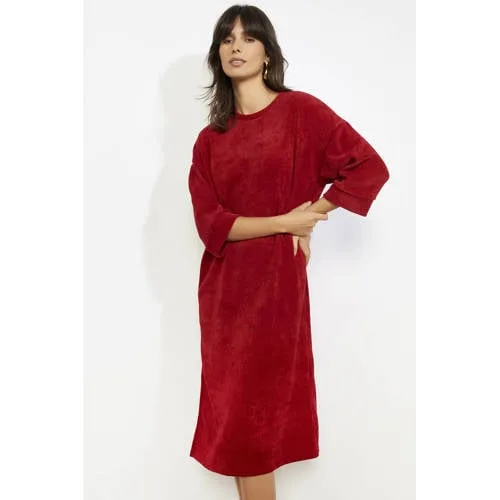 Ga voor moeiteloze stijl met deze LOLALIZA midi-jurk in zacht ribbreisel. De relaxte pasvorm, middellange lengte en subtiele details maken deze jurk geschikt voor allerlei momenten in de week. De effen rode kleur geeft een heldere, vrouwelijke uitstraling, terwijl de velours met cordstructuur zorgt voor een comfortabele feel en een tijdloze look.Zachte ribjurk met doordachte detailsGemaakt van zacht ribbreisel met velourstructuur voor een prettig draaggevoelMidi-lengte voor een middelhoge zoom die rond de kuit valtRelaxte pasvorm die soepel om het lichaam valtA-lijn model dat licht uitloopt naar benedenDriekwart mouwen met rechte inzet voor een rustige, moderne lookSplitjes opzij voor extra bewegingsvrijheid en een speels effectEffen rode kleur, eenvoudig te combineren met je favoriete accessoiresRonde hals en geen sluiting, de jurk trek je eenvoudig over het hoofd aanGeen zakken voor een glad en clean silhouetVoor werk, weekend en alles daartussenDeze midi-jurk leent zich goed voor een dag op kantoor, een lunchafspraak of een ontspannen weekenddag. De splitjes opzij geven voldoende ruimte om makkelijk te bewegen, ook als je veel onderweg bent.LOLA LIZA: eigentijdse damesmodeLOLA LIZA ontwerpt kleding waarin je je de hele dag verzorgd voelt. Het merk staat bekend om vrouwelijke modellen en toegankelijke ontwerpen die passen bij het dagelijkse leven. Met deze jurk heb je een kledingstuk dat geschikt is voor verschillende momenten op de dag.Een zachte, rode midi-jurk die jouw garderobe aanvult met comfortabele eenvoud en een moderne uitstraling.