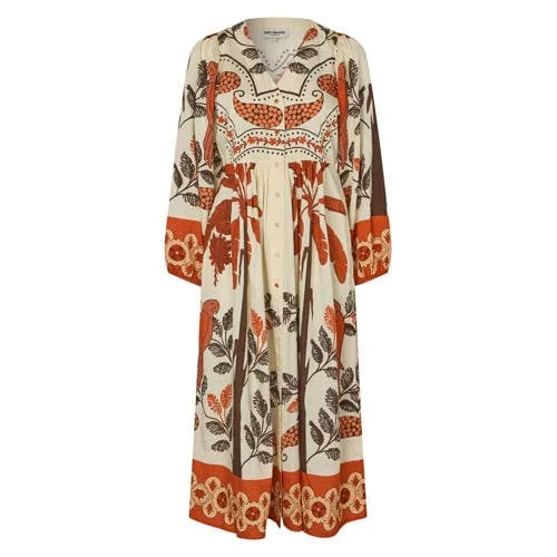 De Lollys Laundry SaraiLL maxi jurk geeft je garderobe direct kleur met de combinatie van oranje en crème. De lange A-lijn valt soepel langs het lichaam en de all over print zorgt voor een speelse, maar rustige uitstraling. Door de lichtvallende stof is deze jurk ideaal voor lentedagen en tussenseizoenen.Details die het verschil maken Lange A-lijn model voor een elegante, zwierige look All over print in oranje en crème voor een opvallende maar zachte kleurencombinatie Lange ballonmouwen die subtiel volume geven aan het silhouet V-hals met knoopsluiting aan de voorzijde voor een vrouwelijke halslijn Gemaakt van een soepel vallende stof met viscose voor een zachte touch Maxi lengte, ideaal met sandalen, laarsjes of sneakers Geen zakken voor een gladde en rustige rokpartijVoor lentedagen en lange weekendenDeze jurk past goed bij dagen waarop je iets opvallends, maar toch gemakkelijk draagbaars zoekt. Combineer met sandalen en een lichte tas voor een ontspannen dagje weg, of draag er laarsjes en een vest bij als het wat frisser is. De knoopsluiting maakt het eenvoudig om de halslijn net zo open te dragen als jij prettig vindt.Lollys Laundry, speels en doordachtLollys Laundry staat bekend om kleding met kleur, print en aandacht voor vrouwelijke lijnen. De ontwerpen zijn bedoeld om vaak te dragen en makkelijk te combineren met wat je al hebt. Zo bouw je stap voor stap aan een garderobe die bij jouw stijl en dagelijks leven past.Een lange jurk met karakter, die je het hele seizoen door graag uit de kast pakt.