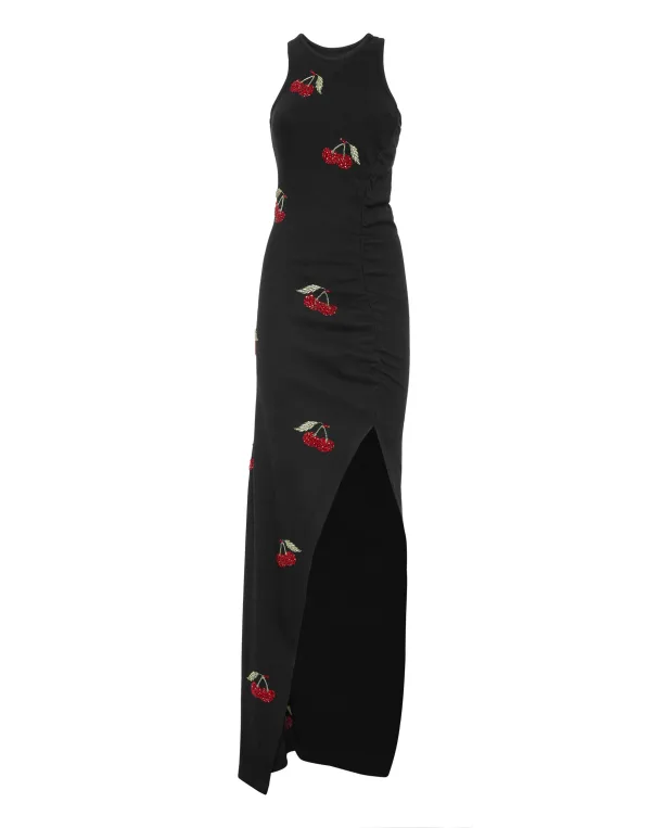 Flatter your figure with this original long sleeveless dress featuring... See all details. Stretch jersey covered with crystals Side seam with gathering The skirt has a side slit Logo patch sewn on the back