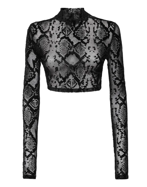 Vier je sensualiteit met deze stretch tule crop top met lange mouwen en een pythonprint met vlokeffect.