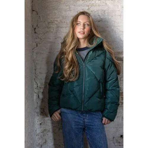 Super mooie winterjas in een stoere flessengroene kleur. Warm gevoerd en sluit met rits en heeft een comfy hoge kraag. Capuchon kan eraf, zit vast met drukkers. Windvangers inn de mouwen. Binnenzak en ophanglus aanwezig.