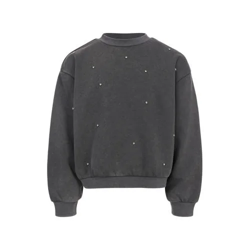 Coole uni sweater met te gekke strass steentjes. Gewassen look! Iets cropped fit, boord valt net op je broekband. Heerlijke comfy sweat kwaliteit. Sweater heeft lange mouwen, ronde hals en is iets loose fit. French Terry 100% Katoen.