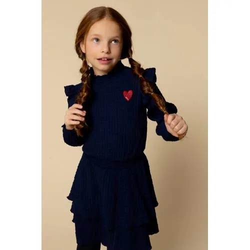Zwierig wijd jurkje in een zachte krinkel stof. Leuk detail is de rode hartjes badge. Mooie classic donker blauwe kleur. Elastische tailleband. Knie lengte of net daarboven.