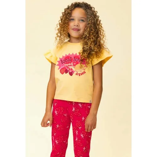 Speels, zacht en helemaal klaar voor elke dag, dit LOOXS little T-shirt voor meisjes is een praktische basic met een vrolijke twist. De frisse gele kleur valt direct op en de printopdruk zorgt voor een lichte, speelse uitstraling. Door de combinatie van katoen met een beetje elastaan voelt het materiaal soepel en zacht aan en beweegt het makkelijk met je meisje mee.Zachte stof en speelse details Gemaakt van 95% katoen en 5% elastaan, voor een zachte stof die licht meerekt en comfortabel aanvoelt. Korte vleermuismouwen geven extra bewegingsvrijheid en een ontspannen pasvorm rond de schouders. Ruches als detail zorgen voor een subtiel, meisjesachtig accent. Ronde hals die mooi aansluit en prettig zit tijdens spelen en bewegen. Printopdruk aan de voorkant voor een eigentijdse, speelse look. In verpakking zit 1 T-shirt als basisitem in de kast.Elke dag makkelijk te combinerenDit T-shirt past eenvoudig bij een korte broek, rok of fijne jeans. De lichte stretch en de luchtige korte mouwen maken het een praktisch kledingstuk voor schooldagen, speelafspraken en ontspannen momenten thuis.LOOXS little, speciaal voor kinderenLOOXS little ontwerpt kleding die past bij het leven van actieve kinderen. De ontwerpen zijn doordacht, met aandacht voor draagcomfort en moderne details, zodat kinderen zich vrij kunnen bewegen en jij weet dat de afwerking is afgestemd op dagelijks gebruik.Een speels T-shirt dat zorgt voor gemak bij het aankleden en comfort tijdens het dragen.