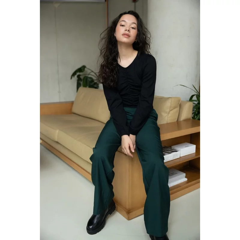 l Wauw! Deze zwarte top in krinkel stof is wel de bomb! Mooie fit met een kleine v-hals en opening op de rug maken van jou een real fashion queen. Wijde pofmouwtjes. Natuurlijk met alles te combineren, maar ook zeker te gek voor de feestdagen!
