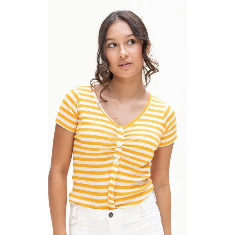 Te gekke top waar je alle kanten mee op kan. Aan voorkant zit bij knopen rij zit een verstelbare lus waarmee je de top korter kan zetten, als je de lus los laat hangen dan is het een normale fit. Zomerse gele streep. Stoer rib jersey. V-hals.