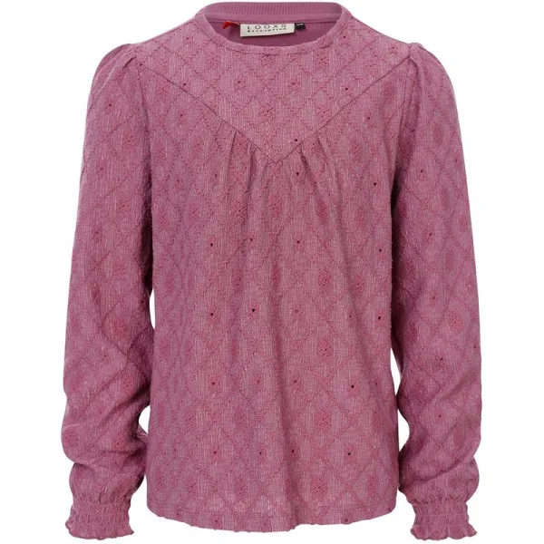 Loose-fit kanten top in een trendy lila kleur. Jersey achterkant. Ideaal kledingstuk in je nieuwe garderobe daar je het met alles kan combineren. Sluit in de nek met een knoopje. Geborduurd hartje op de borst. Gesmockte uiteindes bij de mouwtjes.