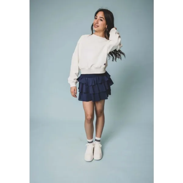 Coole sweater met een leuke navy rugprint. Iets cropped fit, boord valt net op je broekband. Loose-fit shape.