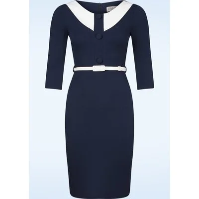 - Bij topvintage.nl kun je Lori Pencil jurk in navy en wit kopen voor slechts €48,95