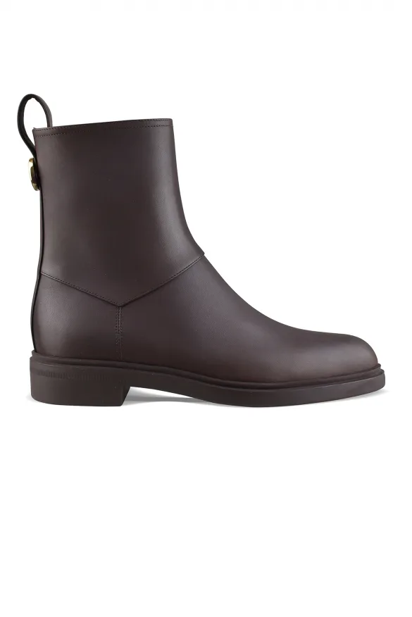 Loro Piana Kilda-laarzen van bruin leer.Gegraveerd goudkleurig metalen detail aan de achterkant.Ritssluiting aan de binnenkant.Bijpassend leren lipje.Ton-sur-ton rubberen zool.100% gewaxt kalfsleer.Gemaakt in Italië.