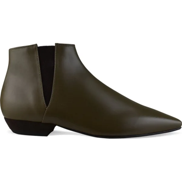 Sumire laarzen Loro Piana van kakigroen glad kalfsleer.Zwart elastiek aan de zijkanten.Puntige teen.Leren zool.Kleine bruine suède hak van 2,5 cm.Made in Italy.