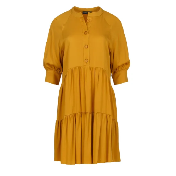 Deze donkere mosterdkleurige jurk is gemaakt van geweven viscose. Het heeft een ronde halslijn. Er is een 3 cm brede sluiting aan de voorkant met sierknopen die open of dicht gedragen kan worden. De jurk heeft raglan bisschopsmouwen van ¾ lengte met 2 knopen aan de manchetten. Er zijn twee brede ruches: één vanaf de taille en één vanaf het midden van de rok. De jurk heeft een los silhouet en valt boven de knie.