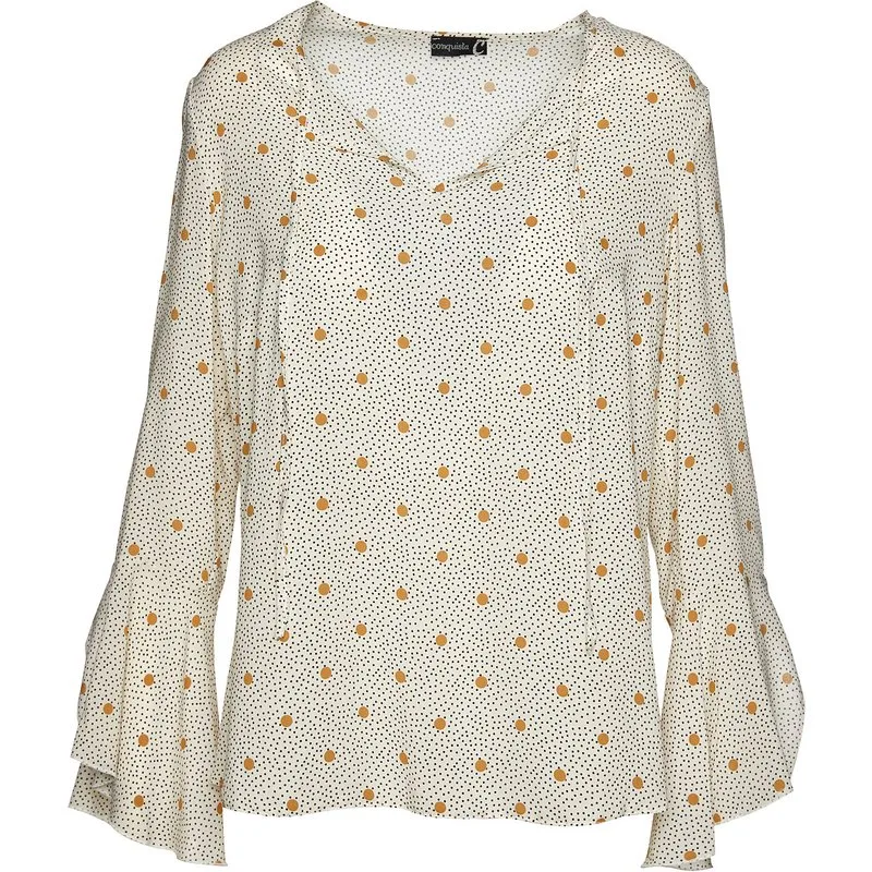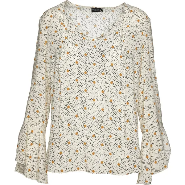 Losvallende top van bedrukte stof, 100% viscose. Ronde halslijn die aan de voorzijde wordt gesloten met zwarte plastic bandjes. Lange uitlopende mouwen. Darts bij de buste. Afgeronde zoom. Licht A-lijn silhouet. Afmetingen voor maat 38/M (in cm): Schouder -40, Borst-51, Taille-50, Onderkant-59, Mouwlengte -54, Lichaamslengte-69.