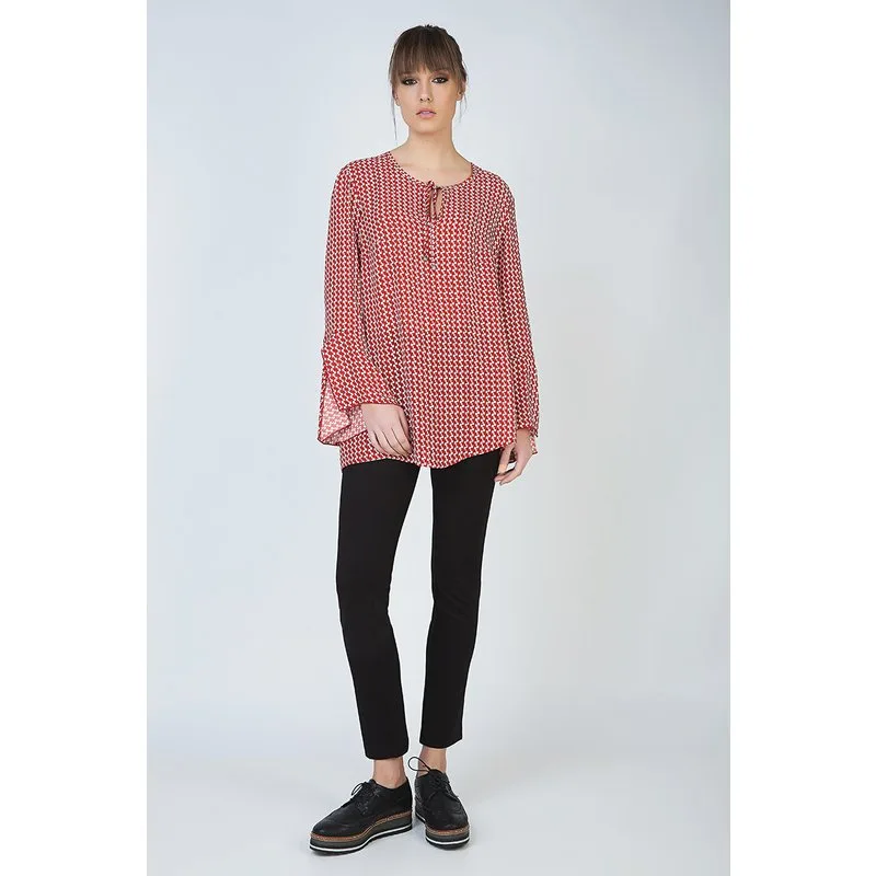 Loose Fit Top met print en strikdetail van Conquista Fashion in stretchstof. Ons model is 176 cm en draagt maat 36/S. Gemaakt in Griekenland.