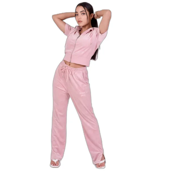 Elastisch trekkoord in de tailleSplit onderaan de benenNormale zijzakkenPXP all-over patroon op fluweel materiaal, perzikhuid effectGeborduurd logo op de voorkant100%Polyester