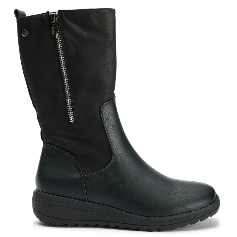 Zwarte Lotus Valmoral dameslaarzen, gemaakt van synthetisch materiaal en een rubberen zool. Voorzien van: rits aan de binnenkant, hiellus, elastische zijsplit en neprits aan de buitenkant.