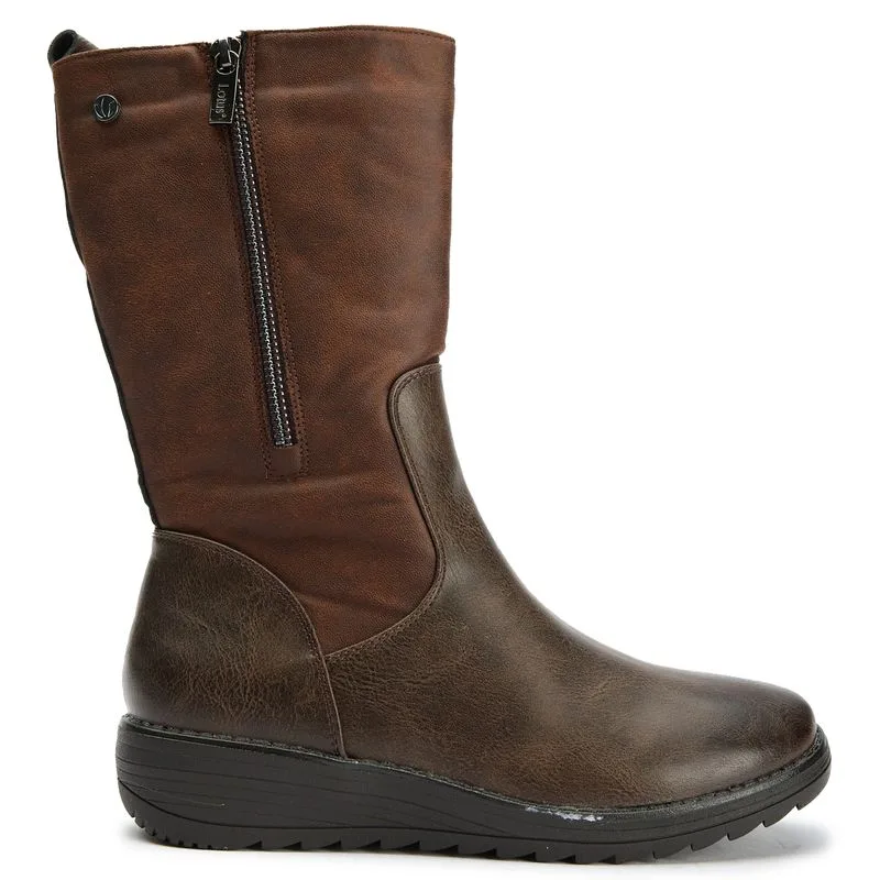 Bruine Lotus Valmoral dameslaarzen, gemaakt van synthetisch materiaal en een rubberen zool. Voorzien van: rits aan de binnenkant, hiellus, elastische zijsplit en neprits aan de buitenkant.