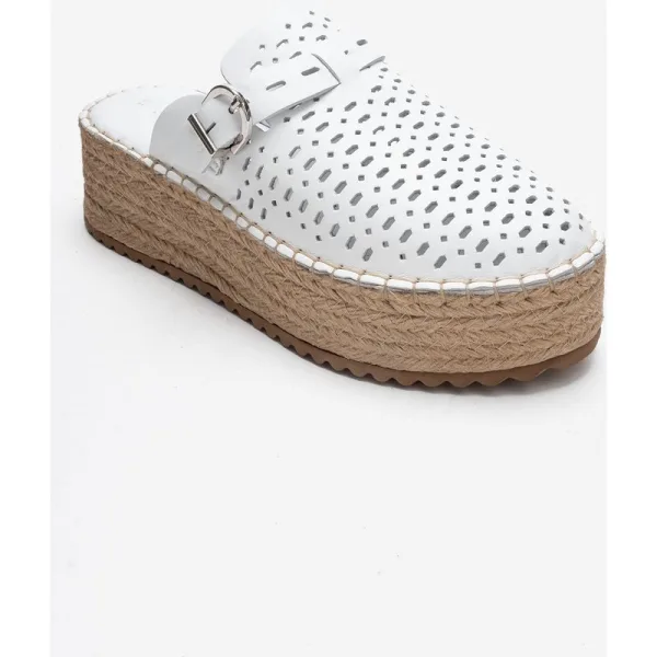 Blokhak plateausandaal van echt leder met lasercut details en gevlochten jute plateau. Open teen met gesloten bovenwerk. Handgemaakt in Turkije. Hakhoogte 5 cm.