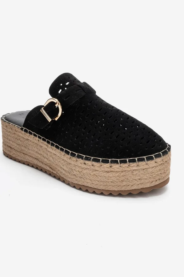 Blokhak plateau sandaal van echt leer met lasercut details en geweven jute zool. Gesloten teen slide met ambachtelijk vakmanschap en ademende structuur. Handgemaakt in Turkije.