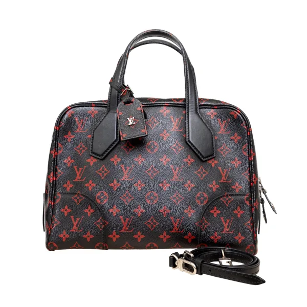 VINTAGE, RRP ALS NIEUW De Louis Vuitton Dora Soft Infrarouge Canvas MM Bag uit de lente/zomercollectie van 2015 is een verbluffende en gedurfde update van Creative Director Nicolas Ghesquiere. Met een glanzende zwarte gecoate canvas en een diep rode monogramprint, combineert deze tas geschiedenis en modern design. Kenmerken zijn onder andere een olijfgroene voering met LV-logo, palladium hardware oogjes en een kleine metalen LV-handtekening op het bagagelabel. Inbegrepen: Schouderriem. Opmerkingen: Er zijn enkele imperfecties op de handvaten. Afmetingen: breedte: 787 mm, hoogte: 558 mm, handgreepval: 254 mm