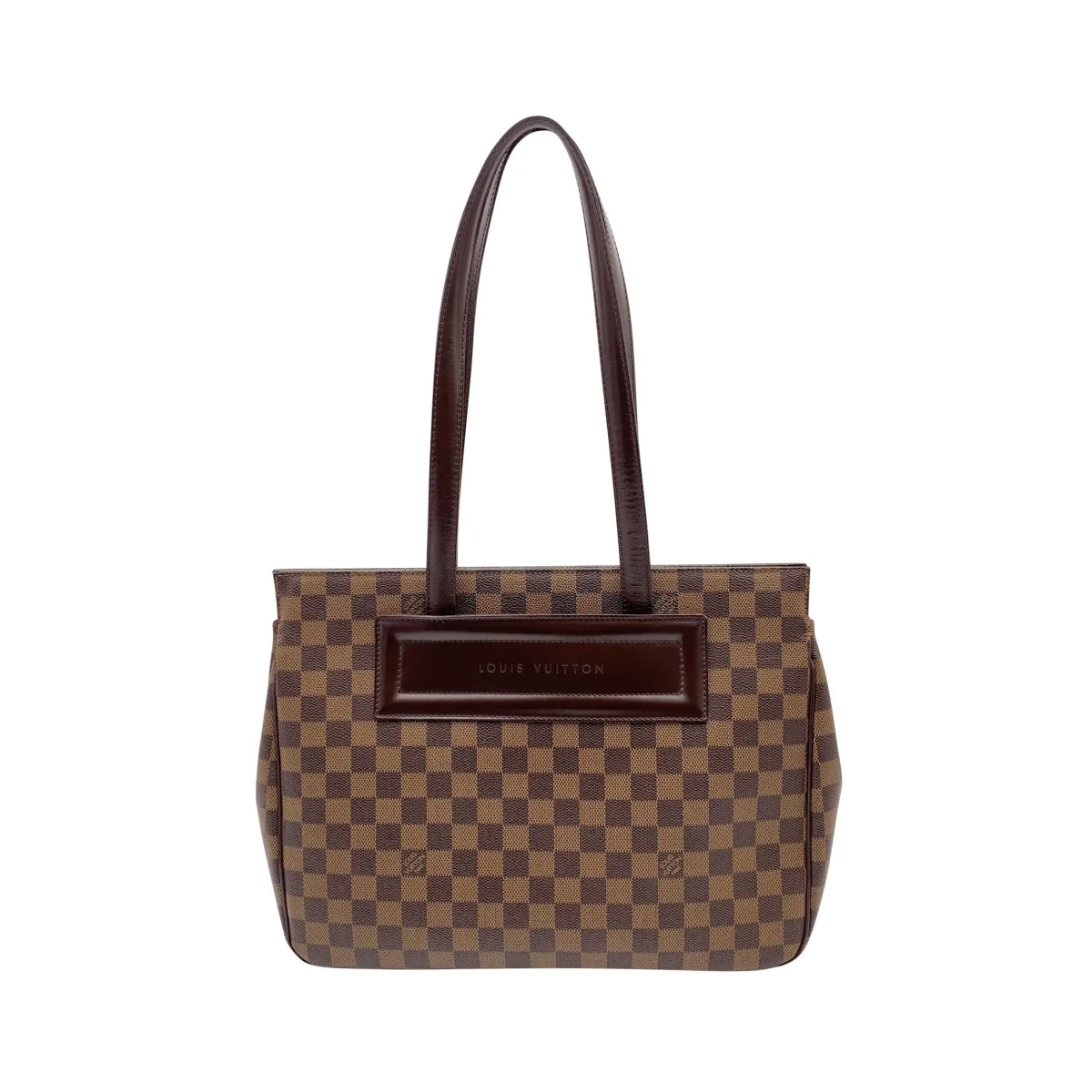 Aanbevolen verkoopprijs Er zijn tassen die aanvoelen als een klein stukje Parijse elegantie dat de tand des tijds heeft doorstaan – en de Louis Vuitton Parioli is er daar één van. Deze vintage Damier Ebene canvas tas uit de jaren 2000, gemaakt in Frankrijk, is een perfect voorbeeld van Louis Vuittons vermogen om alledaagse functionaliteit te combineren met onmiskenbare luxe. Het middelgrote model is vervaardigd van het iconische Damier Ebene canvas, gecombineerd met bruine leren handvatten en afwerking die de tas een verfijnde structuur geven. De magnetische sluiting aan de bovenkant zorgt voor een strak en moeiteloos ontwerp, terwijl de extra schouderband de tas veelzijdiger maakt voor modern gebruik. Binnenin opent de tas naar een opvallende oranje voering, met twee open zijvakken voor gemakkelijke organisatie en een D-ring voor sleutels of accessoires. Aan de binnenkant bevindt zich ook het klassieke "LOUIS VUITTON Paris - Made in France" label, met de seriecode AR0052 en het serienummer op de achterkant van de D-ring – een kenmerk van die tijd. Deze Parioli tote, afgewerkt met zilverkleurige metalen details, is zowel elegant als functioneel: een vintage item dat de rijke historie van Louis Vuitton combineert in een compacte, alledaagse vorm. Of je hem nu als schoudertas of als handtas draagt, het is een tijdloze metgezel die in elke situatie moeiteloos chic aanvoelt. Conditiebeoordeling: B - ZEER GOEDE CONDITIE. Details: Licht gebruikt. Enige slijtage aan de onderste hoeken. De schouderbanden vertonen lichte plooien aan de onderkant waar ze buigen door gebruik. Bekijk de foto's zorgvuldig en vraag gerust als je meer details wilt weten of twijfels hebt. Afmetingen (cm): Diepte: 10,2 Hoogte: 26,7 Lengte: 34,3 Overige details: Stofzak? Nee Sleutels? Nee Doos? Nee Afmetingen: breedte: 102 mm lengte: 343 mm hoogte: 267 mm lengte schouderband: 0 mm hoogte handvat: 0 mm