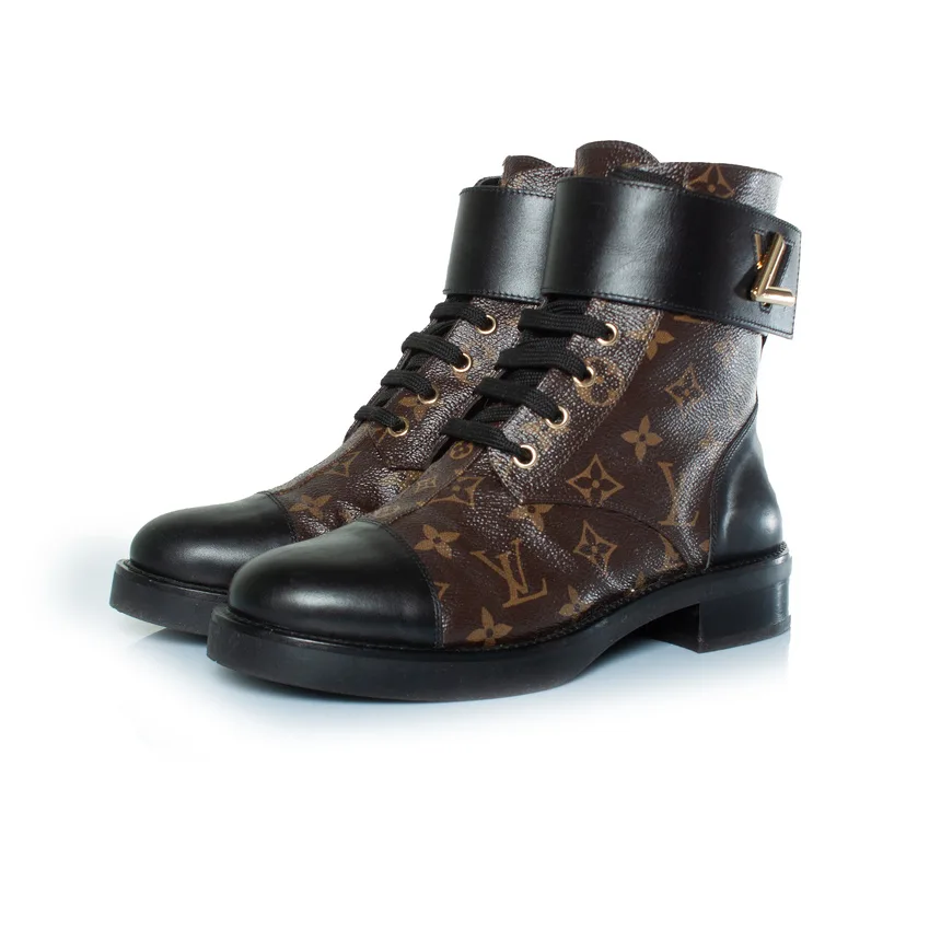Aanbevolen verkoopprijs Louis Vuitton, wonderland flat rangers in monogram canvas. Het artikel verkeert in goede staat. STAAT: goede staat MAAT: 38 BINNENZOOLAFMETINGEN: 24 cm HAKHOOGTE: 3 cm PLATFORM: 2 cm SCHACHTHOOGTE: 15 cm BREEDTE BOVENKANT: 10 cm MATERIAAL: canvas, leer KLEUR: bruin, zwart ARTIKEL NUMMER: 8368