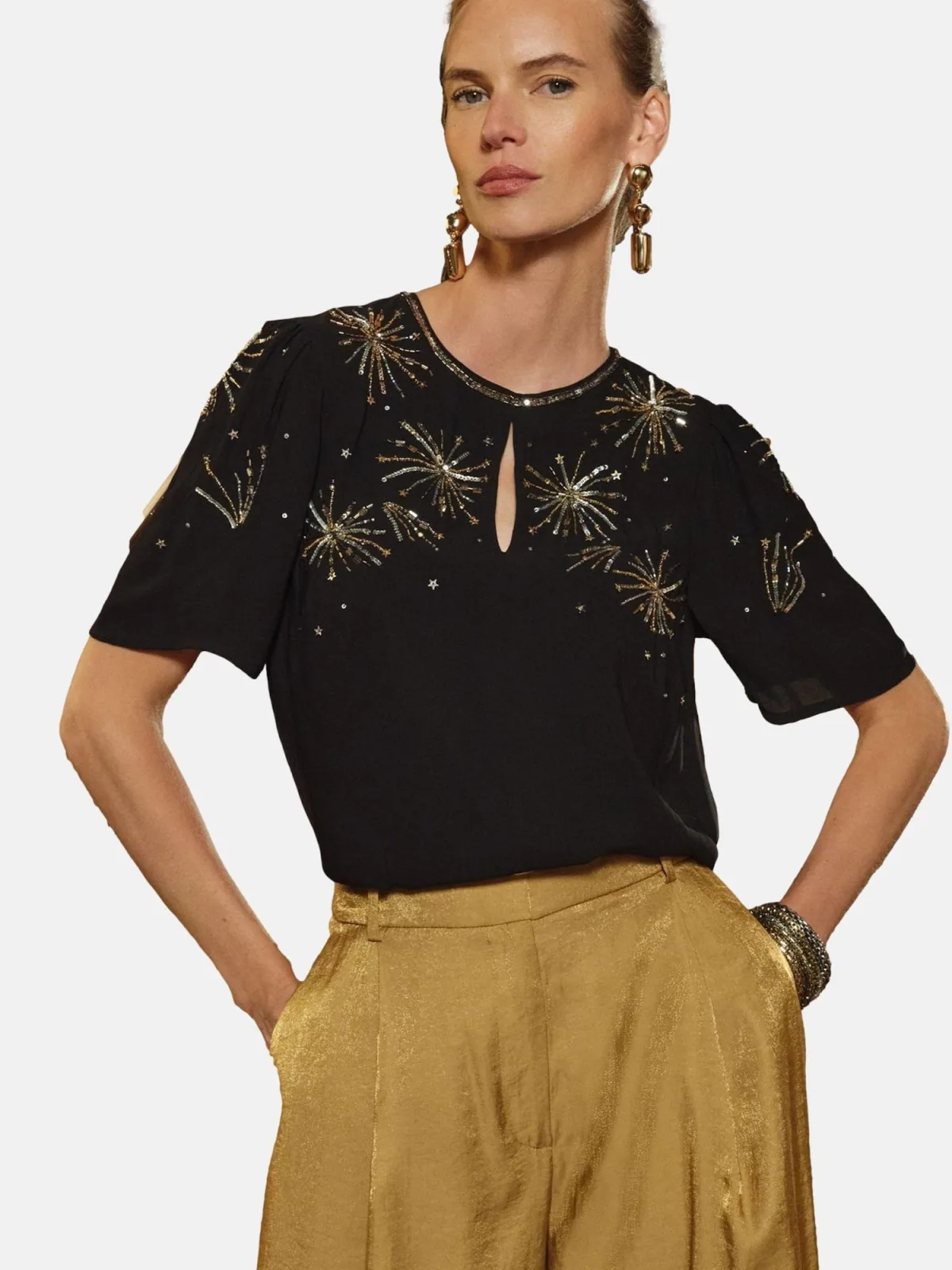 Blouse type: Blouseshirt; Design: Gevoerde zoom/rand; Type sluiting: Knoopsluiting; Materiaal: Viscose; Kraag: Zonder kraag; Details: Cut-outs, Pailletten, Sierstenen; Extra's: Glanzend; Pasvorm: Losse pasvorm; Armlengte: Kwartmouw; Lengte: Normale lengte