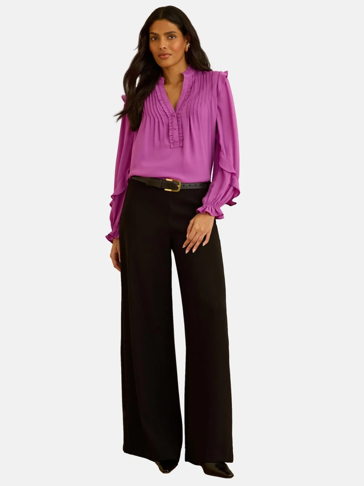 Blouse type: Wijde blouse; Design: Pofmouwen; Type sluiting: Knoopsluiting; Motief: Effen; Kraag: Tuniek kraag; Details: Ruches, Plooien, Gedrapeerd; Extra's: Biezen; Pasvorm: Normale pasvorm; Armlengte: Lange mouw; Lengte: Normale lengte