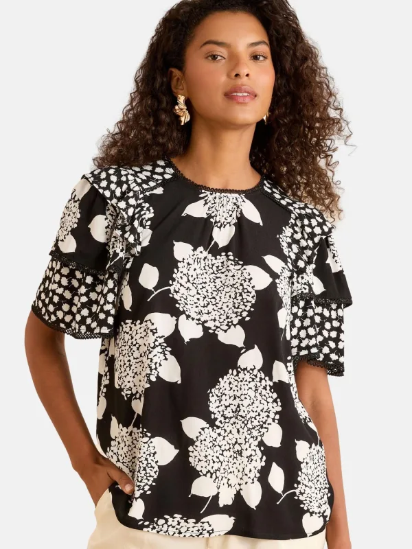 Blouse type: Blouseshirt; Design: Gevoerde zoom/rand, Keyholesluiting; Type sluiting: Knoopsluiting; Materiaal: Viscose; Motief: Bloemenprint; Kraag: Zonder kraag; Details: Cut-outs, Ruches, Kant, Gedrapeerd; Extra's: All-over patroon, Gladde stof; Pasvorm: Normale pasvorm; Armlengte: Halve mouw; Lengte: Normale lengte