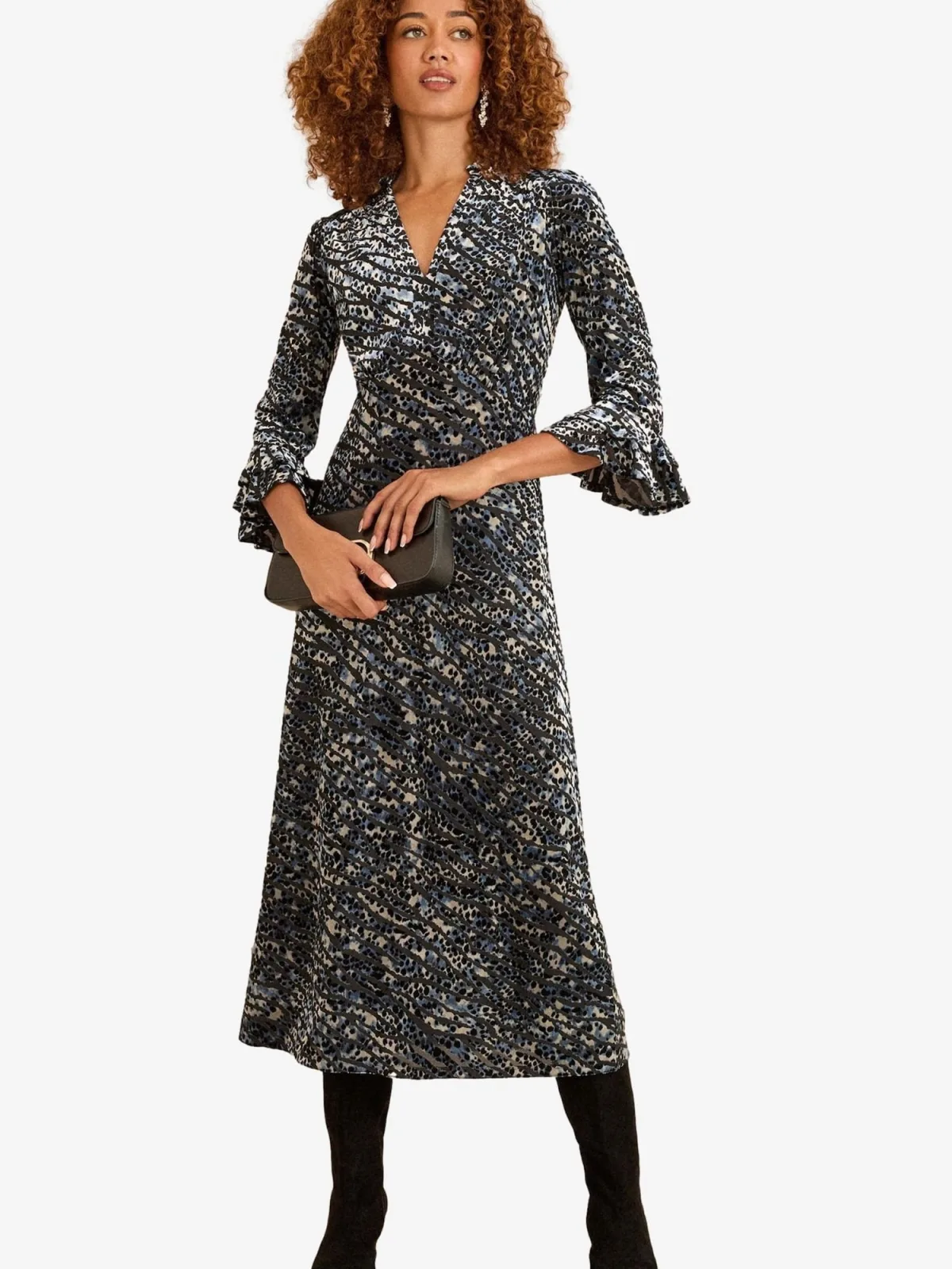 Design: Gevoerde zoom/rand; Materiaal: Fluweel/Nicky Velours; Halstype: V-hals; Motief: Dierenprint; Details: Ruches; Extra's: All-over patroon, Voelt zacht aan; Lengte: 3/4 lengte; Pasvorm: Normale pasvorm; Armlengte: Driekwart mouw
